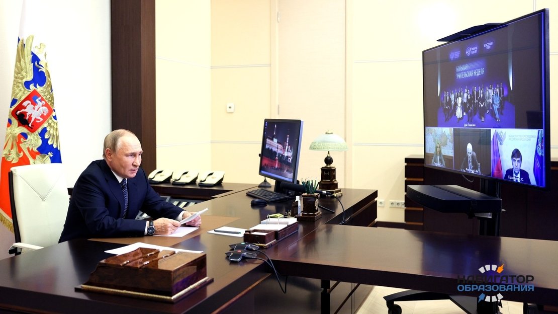 В День учителя Президент РФ Владимир Путин встретился с лауреатами и финалистами конкурса «Учитель года России - 2022» и участниками телешоу «Классная тема!». Среди участников был и министр просвещения РФ Сергей Кравцов.